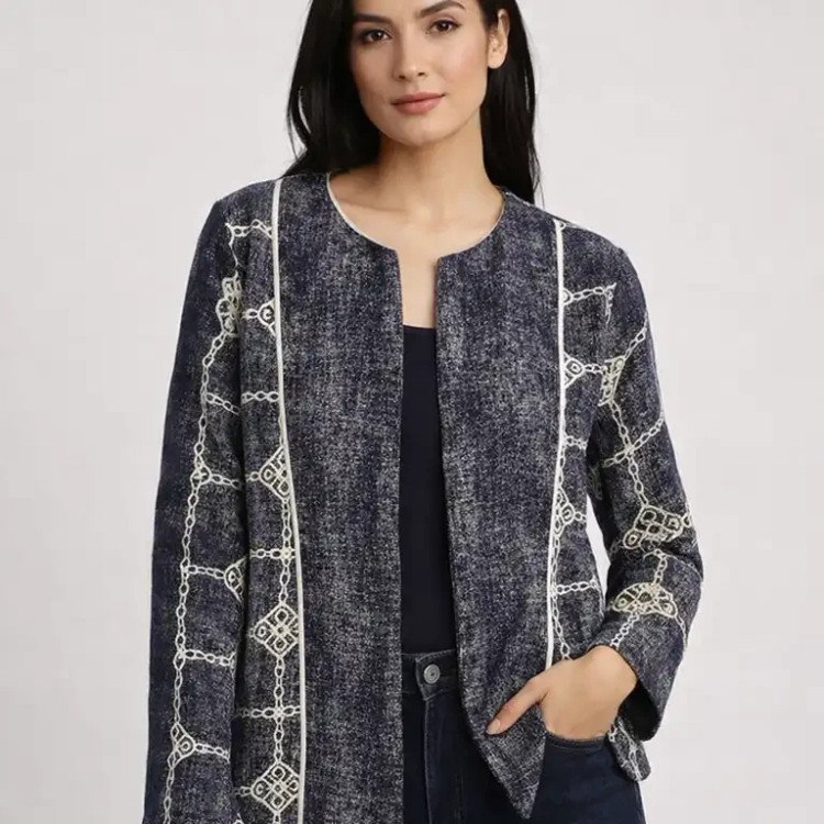 یقه گردوجلوی کت بدون دگمه هست مغزی دوزی در برشها