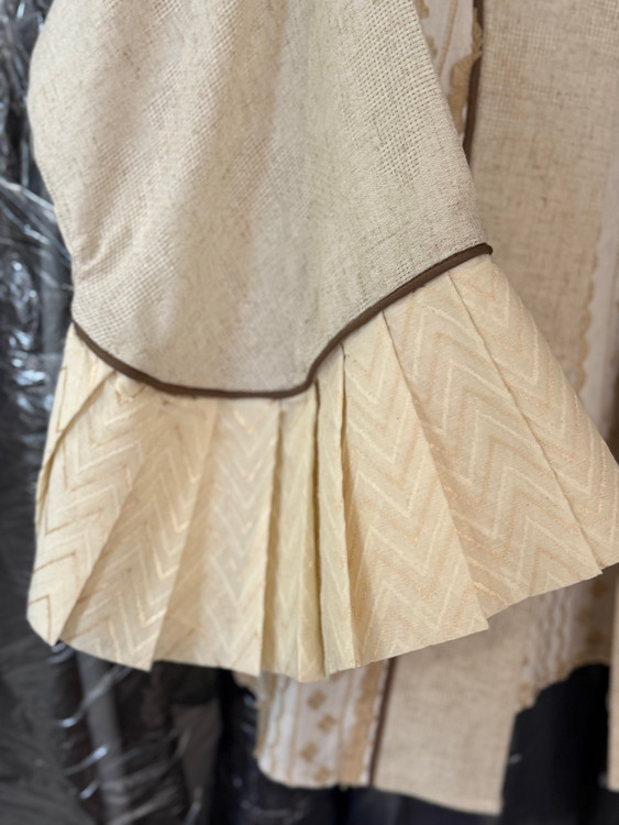 کت لینن سوزن دوزی با دوخت مزونی وجزیات زیبا در کل لباس نوارهای وپارچه متفاوت کارشده در آستین انتخابی شیک برای خانمهای سخت پسند با شلوار کتان قهوه ای یا جین روشن حتی دامن کرم رنگ بسیار زیبا میشه تمام لباس لایی کوبی شده و ایستایی خوبی داره به واسطه رنگ نود لباس با اکثر رنگها ست میشه