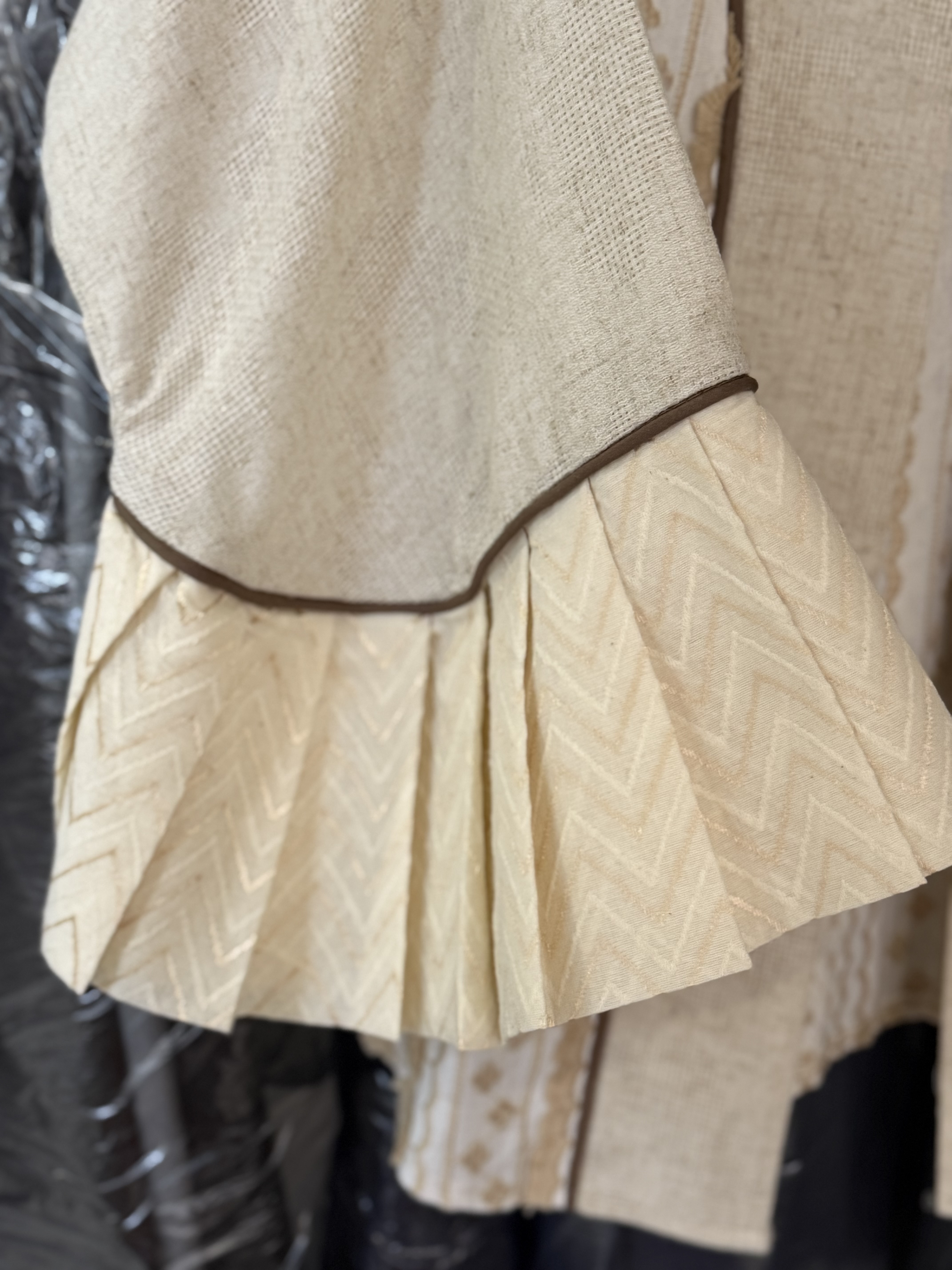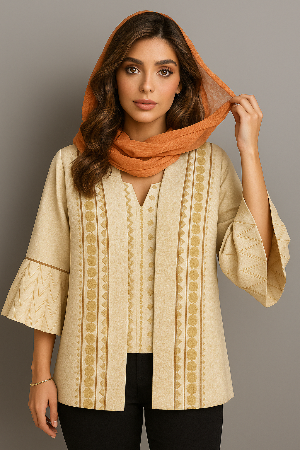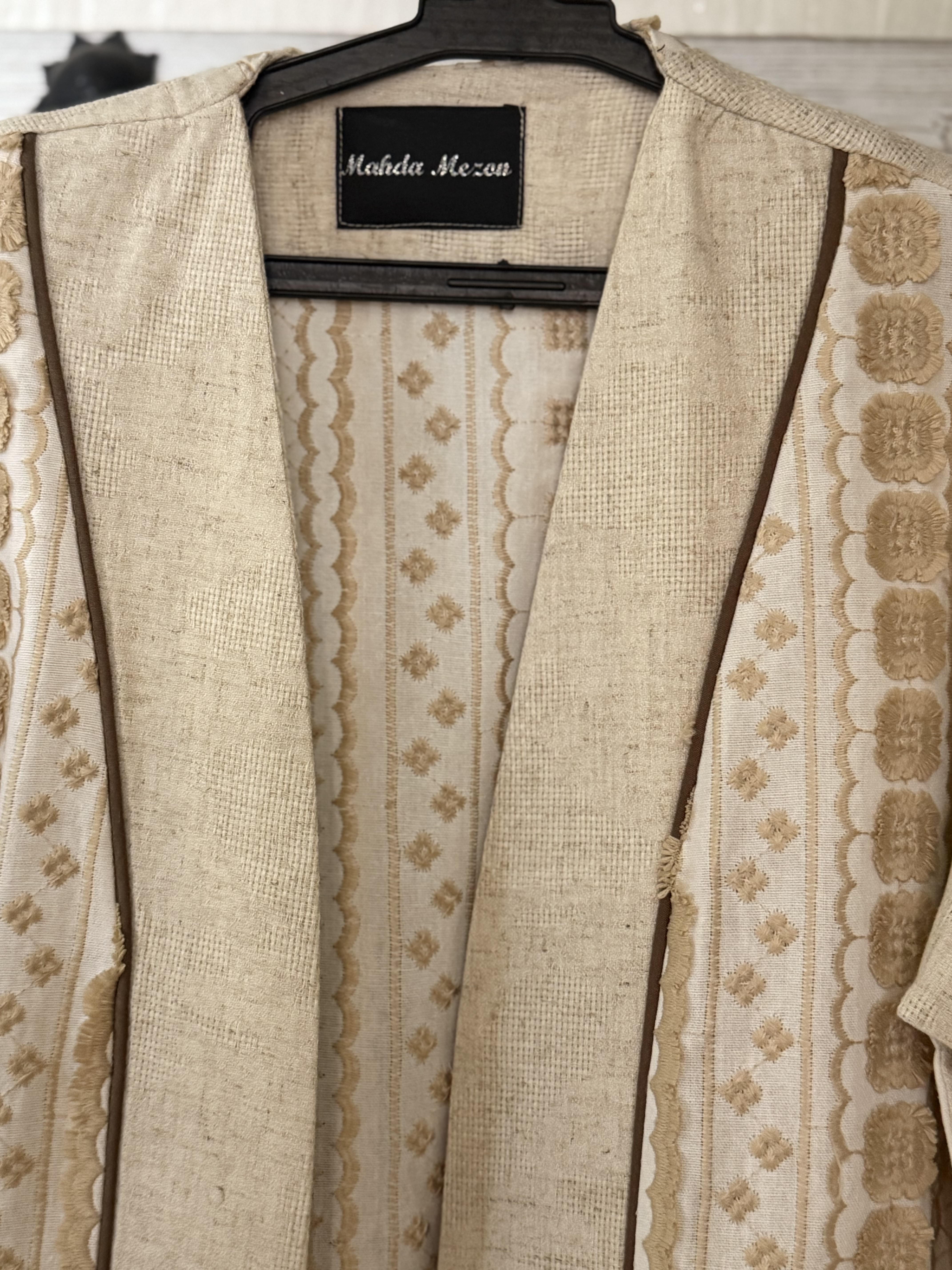 کت لینن سوزن دوزی با دوخت مزونی وجزیات زیبا در کل لباس نوارهای وپارچه متفاوت کارشده در آستین انتخابی شیک برای خانمهای سخت پسند با شلوار کتان قهوه ای یا جین روشن حتی دامن کرم رنگ بسیار زیبا میشه تمام لباس لایی کوبی شده و ایستایی خوبی داره به واسطه رنگ نود لباس با اکثر رنگها ست میشه